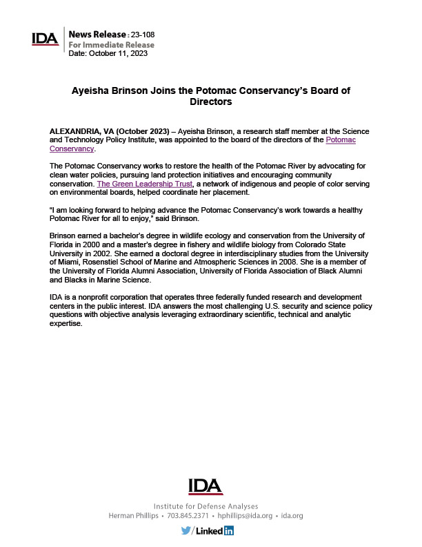 ALEXANDRIA, VA (October 2023) – Ayeisha Brinson, a research staff member at the Science and Technology Policy Institute, was appointed to the board of the directors of the Potomac Conservancy.