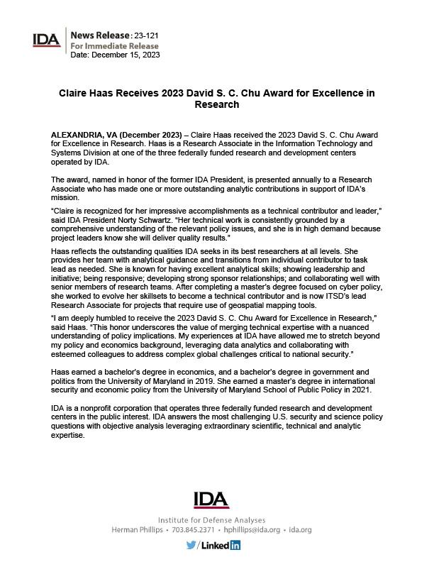 ALEXANDRIA, VA (December 2023) – Claire Haas received the 2023 David S. C. Chu Award for Excellence in Research. Haas is a Research Associate in the Information Technology and Systems Division at one of the three federally funded research and development centers operated by IDA.