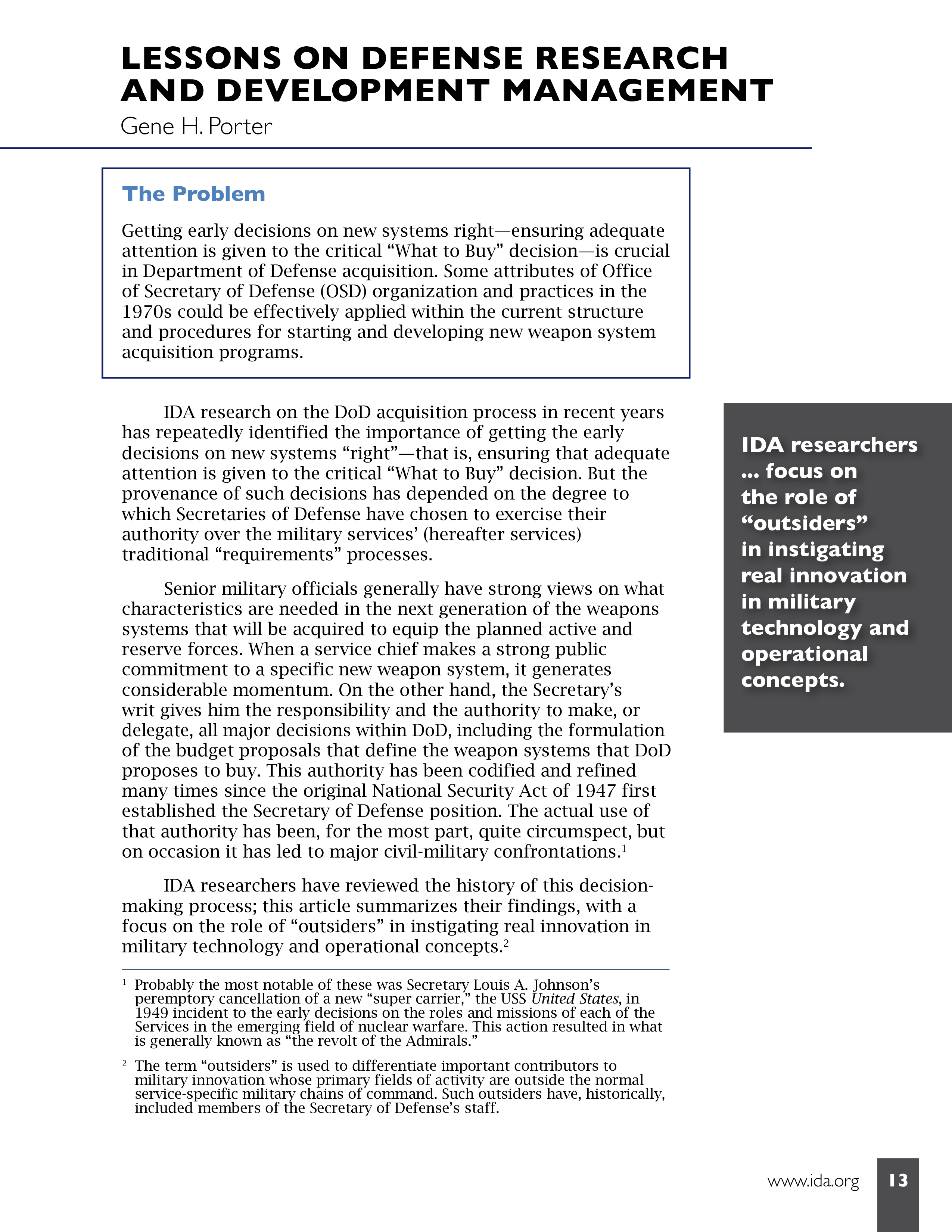 IDA Research Notes Fall 2014 Lessons on Defense Research and Development Management