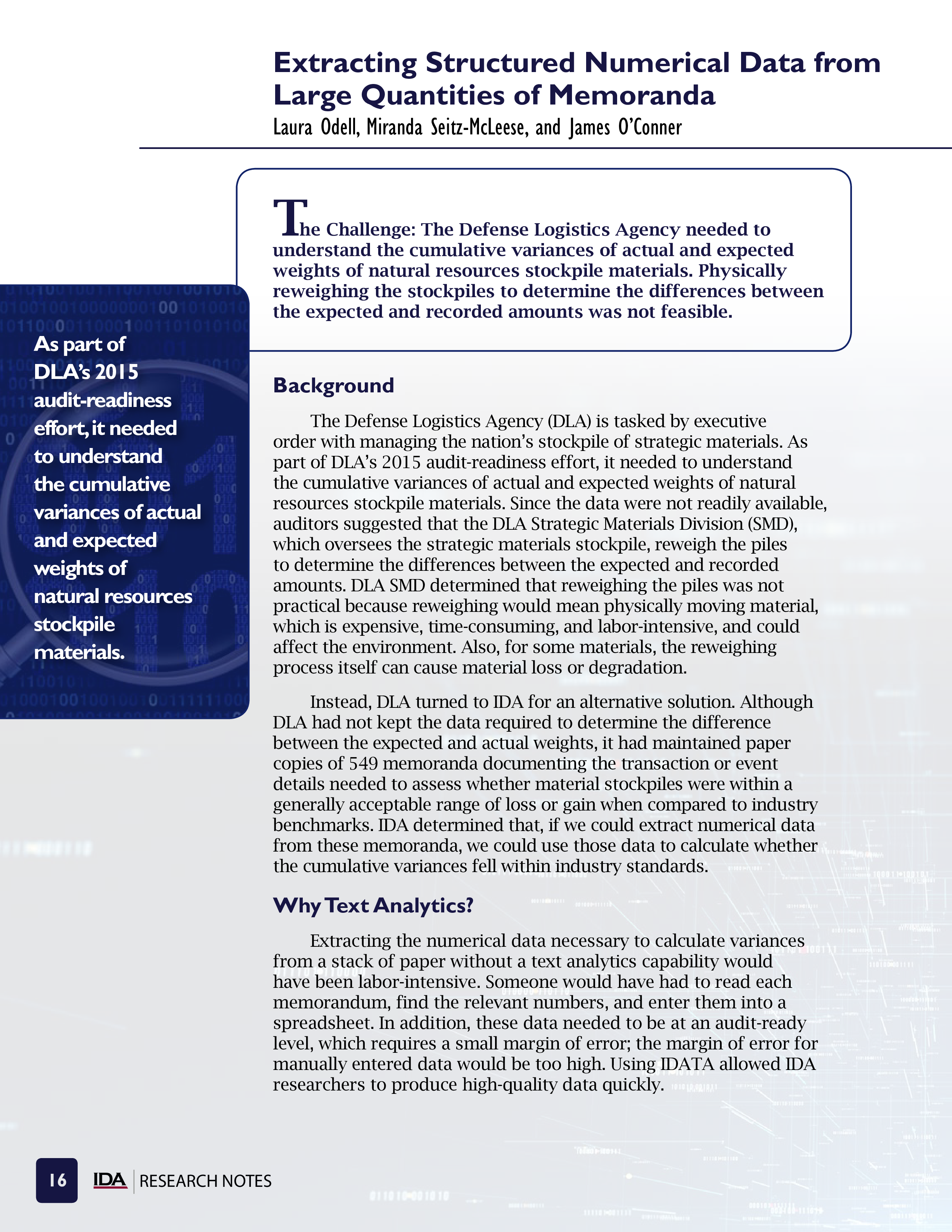 The Challenge: The Defense Logistics Agency needed to understand the cumulative variances of actual and expected weights of natural resources stockpile materials. Physically reweighing the stockpiles to determine the differences between the expected and recorded amounts was not feasible.