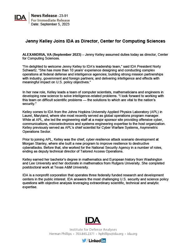 “I’m delighted to welcome Jenny Kelley to IDA’s leadership team,” said IDA President Norty Schwartz. “She has more than 10 years’ experience designing and conducting complex operations at federal defense and intelligence agencies; building strong mission partnerships with industry, government and foreign partners; and delivering intelligence and effects with meaningful impact on U.S. policy objectives.”