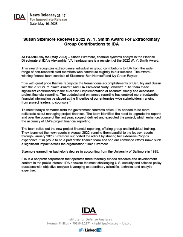 ALEXANDRIA, VA (May 2023) – Susan Sizemore, financial systems analyst in the Finance Directorate at IDA’s Alexandria, VA headquarters is a recipient of the 2022 W. Y. Smith Award.