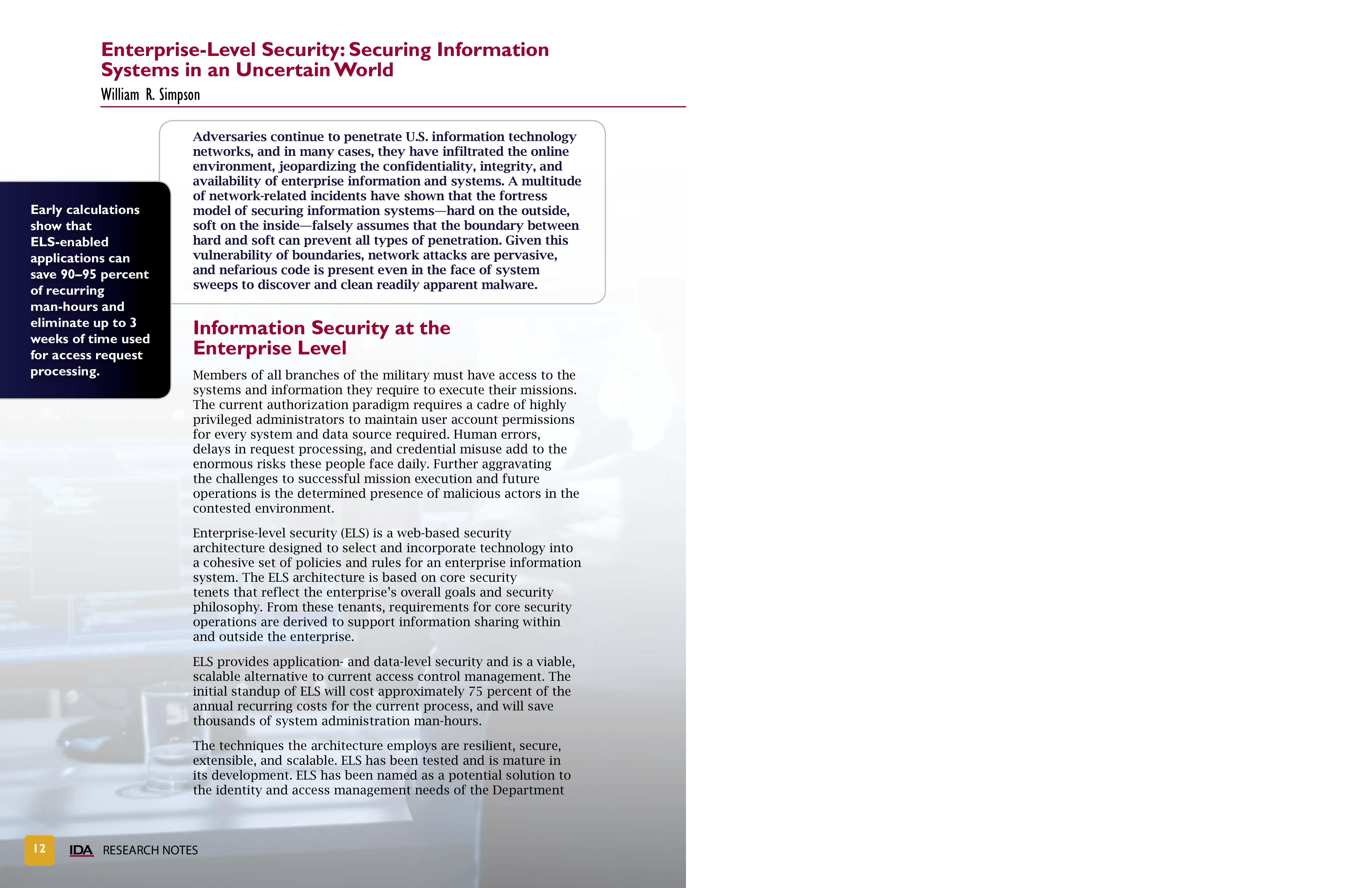 Adversaries continue to penetrate U.S. information technology networks, and in many cases, they have infiltrated the online environment, jeopardizing the confidentiality, integrity, and availability of enterprise information and systems. A multitude of network-related incidents have shown that the fortress model of securing information systems—hard on the outside, soft on the inside—falsely assumes that the boundary between hard and soft can prevent all types of penetration. Given this vulnerability of boundaries, network attacks are pervasive, and nefarious code is present even in the face of system sweeps to discover and clean readily apparent malware.